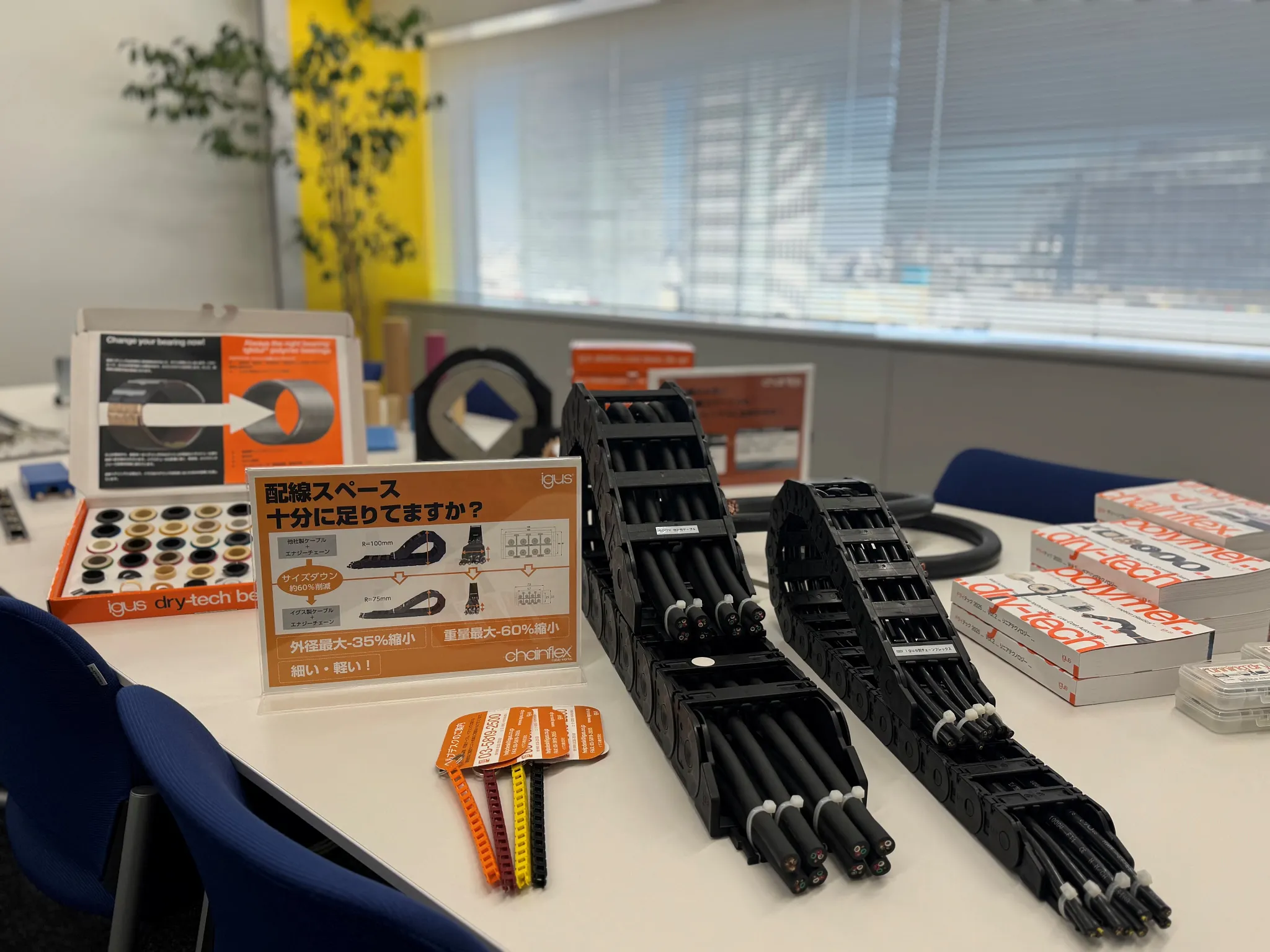 出張社内展示会では、イグスが貴社へ伺い、可動ケーブル・エナジーチェーン・ベアリング・リニアガイドなど可動部の動きを改善する製品を中心に、実物を使ってご紹介します。