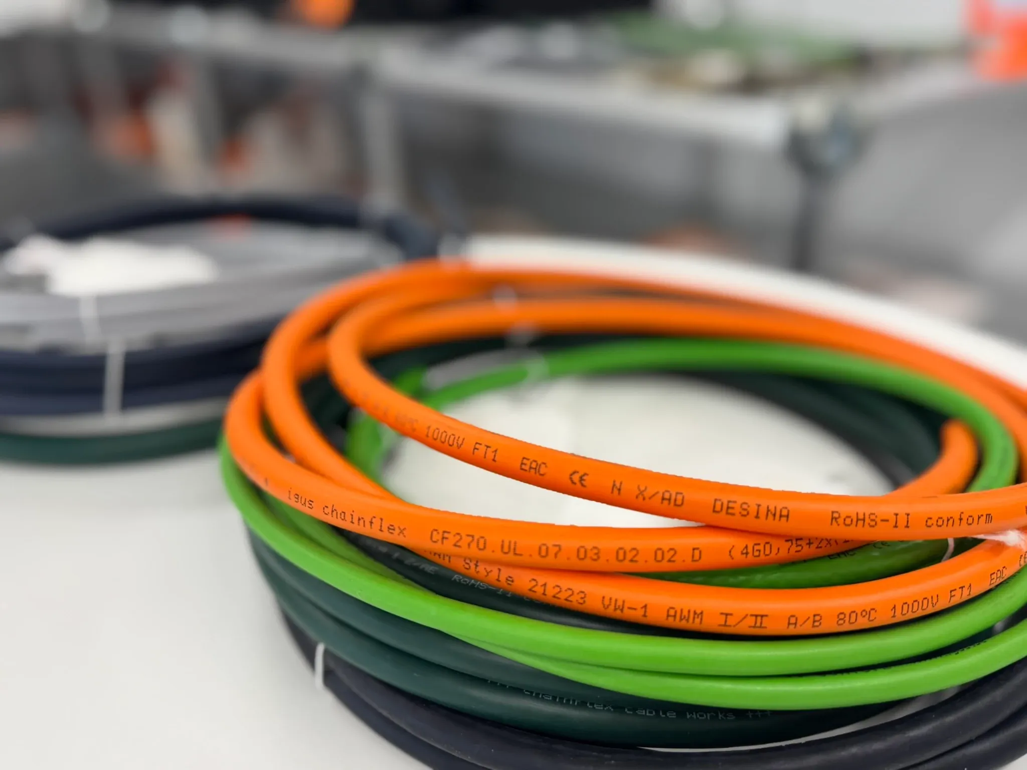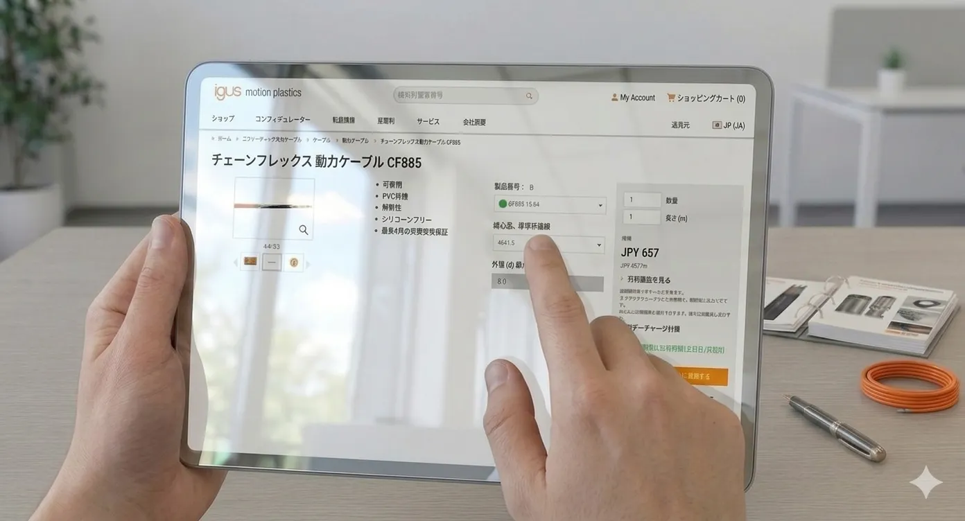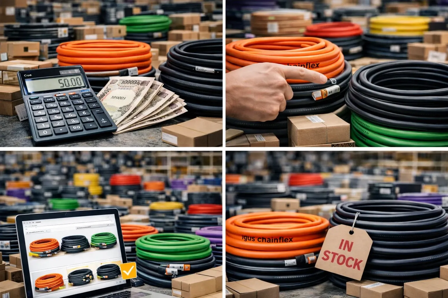 制御・動力ケーブルのCF9などチェーンフレックスの売れ筋製品の中にカット済みケーブルが含まれています。ご希望の製品に「定尺」の表示がないかチェックしてください。