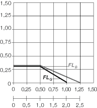 能力線図(フリースパン走行) X軸 : フリースパン長さ (m) FLB/FLG Y軸 : 収納ケーブル重量 (kg/m) 下部目盛り : ストロークS (m) FLB = ベント走行(たわみが許容範囲内) FLG = 水平走行(推奨取付け方法) ご注意: フリースパン長さは、動きの正方向のみ