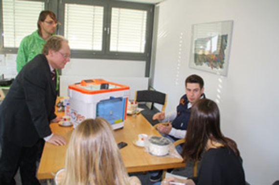 物理の先生Thomas Kerschner(後ろ)、取締役Wolfgang Knoch(右)、イグス代表Albert Thönniges(左)とOtto-Hahn-Gymnasiumベンスベルク校の学生との3Dプリンター贈呈式