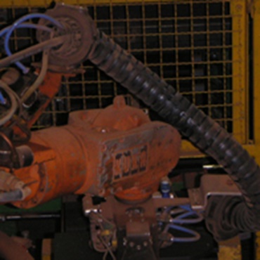 タイル工場のパレタイジングロボットの甚大な埃や汚れの負荷。 トライフレックスR エナジーチェーンは研磨性の埃に対して隙間なく、耐性を有する必要があります。