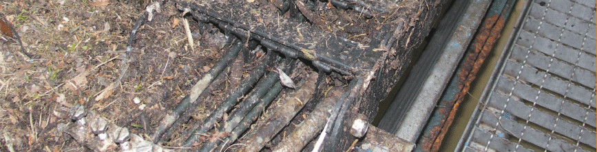さらに、空気中にはさまざまな物質が漂い、これが設備技術に影響を及ぼします。 コンポスト場内の空気を測定したところ、アンモニアおよび有機酸がかなりの濃度で検出されました。 場内はいたるところに有機物質の粘性膜が形成され、ケーブル保護管にもそれが付着します。 表面の酸性度はおよそpH5。「熟成場ではスチール鋼は使えません。使用できるのは、ステンレス鋼V4A(SUS316Ti相当)のみです」と、同氏は語ります。