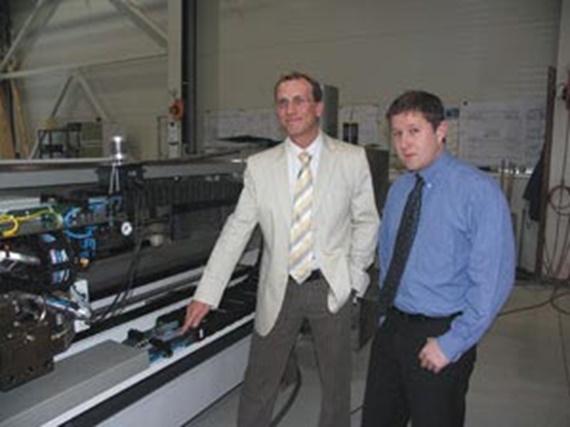 オリバー・フェヒナー氏(左) ステファン・ボブリッツ氏(右):「我々の新開発-グラビアシリンダーの旋盤・破砕・研磨装置-にはハーネス済み電力供給システム。 これが市場のスタンダードになるでしょう」
