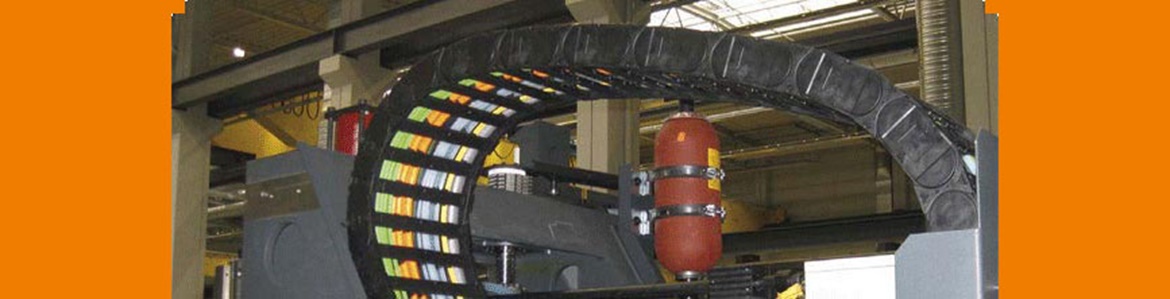 工作機械の取付スペースに制限がある場合、竪スタンド型または吊り下げ型など垂直使用もできます。 特に垂直使用では、エナジーチェーンの竪スタンド型使用が、多くの機械で用いられています。 竪スタンド型ではエナジーチェーンが内側や外側に揺れないように固定端が取付けられます。