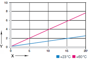最大推奨面圧は、材質の機械的特性を示します。 したがって、摩擦特性への言及はできません。 温度が上昇すると、イグリデュールA180製スライドベアリングの圧縮強度は低下します。 図02は、この関係を明確にしました。