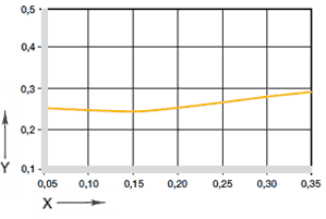 最大推奨面圧は、材質の機械的特性を示します。 したがって、摩擦特性への言及はできません。 温度が上昇すると、イグリデュールR製スライドベアリングの圧縮強度は低下します。 図02は、この関係を明確にしました。