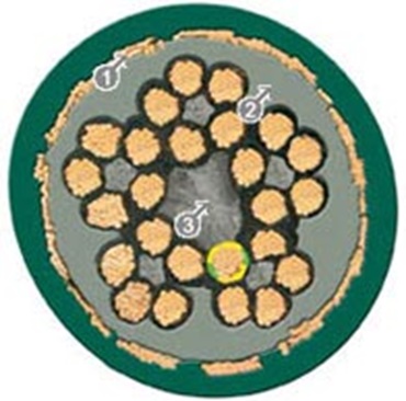 非常に高度な技術で幾重にも撚られた内部構造をケーブルに成形する束撚り方法を採用することにより、この問題を解消することができます。特別なピッチ素線を撚り、出来た線心をケーブルがらせん状に1本の束に撚り上げます。ケーブルの断面が大きい場合、引張力を軽減する中心材の周りに撚り上げます。さらに、線心の束を引張強度のある中心材の周りに撚っていきます(写真2参照)。