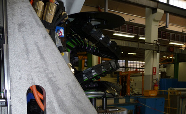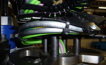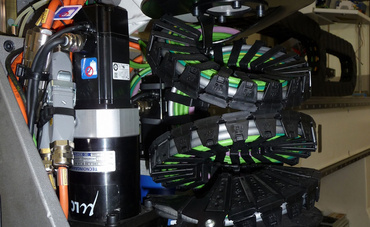 この機械は一般的には木工用に使われますが、違う材質の加工にも使うことは可能です。(例:PVC、ポリプロピレン、アルミニウム、他) この機械は一般的に木材加工に使われています。加工品の形状どおりに切るには、最大1,440°を自転する動きを含めてあらゆる方向に工具を動かす必要があります。 ケーブル保護管に求められたのは、回転動作に追従できるということと、軽量であることでした。 過去に、電空式のディストリビュータを使って解決しようとしたところ、非常に重く、コストがかかり、かつ変化に対応できる対応力が欠如していたことも大きく、失敗に終わっていました。 イグスのツイスターバンドがどの点もクリアしていました。 求められていたストローク分を完全にカバーする構造。 軽量かつ低コスト。